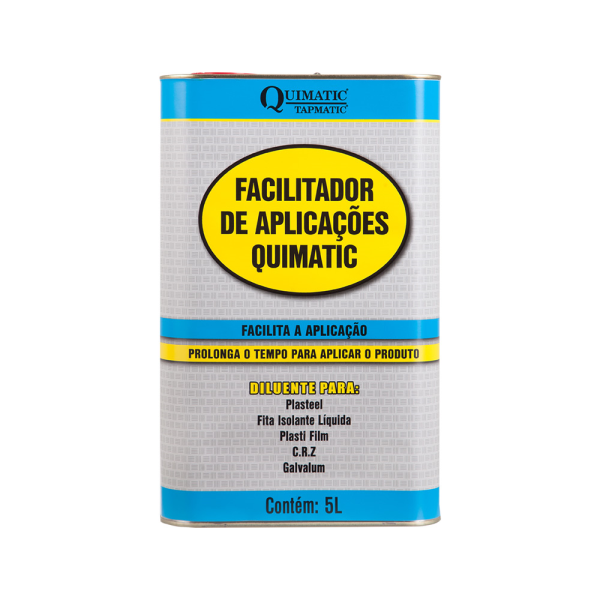 Facilitador de Aplicações Quimatic 5 L - Aplicações com pistola ou imersão. Para diluir: CRZ; Galvalum; Plastfilm; Fita Isolante Líquida; Linha Plasteel (Cerâmico Pintável Azul; Alta Resistência Química e Alta Temperatura). |